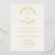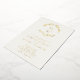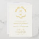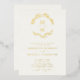 Trendy All in One Real Gold Foil Monogram Wreath Cream Wedding Invitation... The front of our trendy minimalist real gold foil wedding invitation features a metallic gold leafy botanical wreath displaying the bride's and groom's monogram initials above personalised invitation text in golden serif and sans serif typography on a delicate cream background. The cream back of the invitation contains all of the details you would typically see on separate cards in the wedding packet, including reception time and venue, accommodation options, wedding website, RSVP and gift registry information. All example text can be easily revised with your own information on the personalisation template..