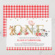 Cute girl's first birthday invitation featuring a faux gold foil word decorated with floral arrangements and some cute watercolor farm animals. This girl's farmyard first birthday invitation, also features a red plaid sash. A cute birthday invitation sure to set the scene for a barnyard themed first birthday party.