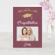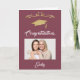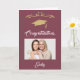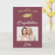 Elegant Gold Ornament Congratulations Graduate Photo Card. Graduation card with graduation cap, custom photo, trendy script and gold ornaments on burgundy red background. Personalise the text inside the card or erase it.