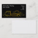 Stylised gold outline of a rollback wrecker with a loaded extended cab pickup truck. This towing business card could be used by repair shops, auto insurance, or body shop repair.