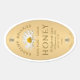 Gold oval honey sticker with daisy photo and vintage honeybees at top and bottom of label. "Honey" is printed in a decorative font. "Product of USA" is indicated at bottom of label. Name of apiary is written in curved font above daisy.