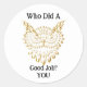 Awesome head and face of an owl in gold, is featured on this classic round sticker. With message, "Who Did A Good Job ? YOU", makes a great sticker for teachers to give their students and even for family members to encourage them to finish work, projects and more around the house!