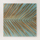 Closeup view of gold painted natural tropical date palm leaf on light muted cyan blue background. Decorative diagonal geometrical floral pattern design.