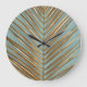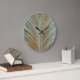 Closeup view of gold painted natural tropical date palm leaf on light muted cyan blue background. Decorative diagonal geometrical floral pattern design.