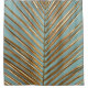 Closeup view of gold painted natural tropical date palm leaf on light muted cyan blue background. Decorative diagonal geometrical floral pattern design.