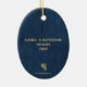 Glamourous faux gold glitter palm fronds on deep blue denim background highlights your favourite photo on these holiday Christmas Oval Ceramic Ornaments. "It's A Wonderful Life", or any greeting you choose, and your names on the back in chic lettering. CHANGE the saying, change the fonts, font colours, even the background colour with the CUSTOMIZE further link.