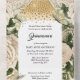 A beautiful all-in-one invitation featuring pale peach beige roses; green leaf foliage; sparkling stars and faux gold butterflies which frame a dazzling golden diamond ballgown full of shimmering faux rhinestone gems. There are templates for your personalised wording and the bottom third has a tear off card which your guests will find useful to find their way to the reception. These are ideal for milestone birthday parties or special events and occasions. Customise the invite to suit your celebration.