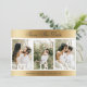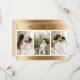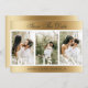 Elegant gold wedding photo save the date card featuring a multi photo collage on a gold background.