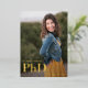 A photo PhD graduation announcement that includes your name, class year, a customisable message, and more. The front of the announcement shows a vertical photo with your words in gold foil. The other side has a gold tone (non-foil) background with black text. Simply swap out the photo, customise the words, add the announcement to your cart, and let everyone know that you accomplished something big.
