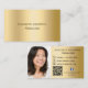 A faux gold looking background. Personalise and add your photo, name, title and contact information. Add your website url/link to the Qr code. With Facebook and Instagram icons. Black text.