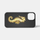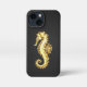 Artistic, polygonal, seahorse of sparkling, gold foil on black background.