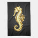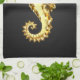 Artistic, polygonal, seahorse of sparkling, gold foil on black background.