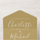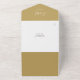 All in one wedding invitation featuring elegant signature script name and monogram initials on a gold background. The invitation includes a perforated RSVP card with your wedding website QR code. Designed by Thisisnotme©
