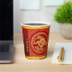An elegant visual of a golden snake with blossoms into a circle (inspired by traditional Chinese paper-cut) with red circle overlay a red and yellow traditional Asian pattern + graphic "HAPPY NEW YEAR" in Chinese and English and old Chinese calligraphy for "snake" on the right on gradiant red colour band. Design on party paper cup. Matching greeting card, holiday postcard, square flat card, round flat card, vertical flat card and more soon.