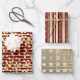 A trio of gift wrap, each with a different design on it but all in gold and a deep Burgundy wine red colour. The first sheet has thin horizontal lines over which vibrant gold confetti dots appear; the second has a vertical thick and thin stripe in-between which is a delicate vertical stripe with beads and the third has thin horizontal stripes threading through medium size gold circles in antique gold. The background colour may be changed to any of your choice.