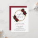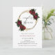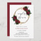 These elegant, glam couples wedding shower brunch invitations feature deep red roses with green foliage and leaves, around a border of faux gold circles. Black and red modern text and romantic script calligraphy are both featured. The background of the front side is white, and the back of the invitation is a matching red.