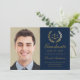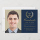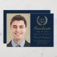 Announce your graduation from law school in style with this elegant custom photo graduation flat card. This classic design template features your photo (3.5x5) to the left and to the right is faux gold scales of justice with laurel wreath and your name, degree, school and date to personalise on a navy blue background. The perfect choice for those graduating from law school. Designed by artist ©Susan Coffey.