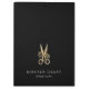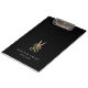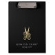 Chic personalised clipboard for your salon or hairstyling business features two lines of custom text in classic white lettering, on a rich black background adorned with a pair of flower-embellished scissors in faux gold foil. Design repeats on reverse side.