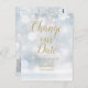 This elegant gold typographic change of date card features an elegant script change our date above your details set in elegant modern gold typography on a snowflakes winter frost background. The reverse has additional details, including your wedding website, with your return address and space for your recipient's address. Designed by Thisisnotme©