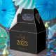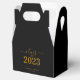 Stylish elegant custom graduation party supply! Celebrate the graduate's accomplishment in style with this trendy graduation favour box. Design features "Class of 2023" in gold script typography on a classic black background. Personalise this product by adding the name and school name. Perfect graduation keepsake. Easy to customise. Congratulations!