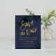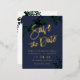 gold script green leaf greenery grey save the date Wedding Invitation Collection. Send your save the date card with this elegant real gold typography with watercolor green leaf foliage on navy blue background, perfect for chic style wedding