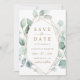 This wedding save the date invitation features painted watercolor eucalyptus and botanical green leaves with a gold geometric frame.