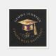 Modern minimalist graduation party black napkins, with gold script initials and name underneath. A stylish watercolor style with your school name in a curved type, and a gold graduation cap. Gold and black type on white.