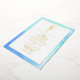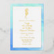 Stylish foil seashore themed wedding invitation, with a aqua and blue watercolor frame, on the front, with gold seahorse and custom gold foil text. Personalise the information for your beach wedding.