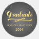 Gold Shine Chalkboard Graduation Round Stickers. Design by Elke Clarke © Visit our shop www.zazzle.com/monogramgallery* for more designs and styles. A simple gold foil typography handwritten script font text overlay (printed photo effect) with the word "Graduate". Black chalkboard background is a printed photo effect. Add your graduate name and graduating year. Perfect for envelope seals on your graduation announcements or graduation party invitations.