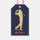 A gold silhouette golfer takes a swing on the front of this birthday gift tag. The image is placed on a dark blue background. The back of the tag is white to make it easy for you to mark, with a different golfer image in matching dark blue. Be sure to see the matching gift wrapping paper and gift bags in our store. *Thanks to ChiliPapers for the silhouette images used in this design.