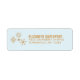 Small return address labels with four elegant golden snowflakes with fancy crystalline shapes. A frosty light blue background.