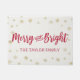 This gold snowflake "merry and bright" christmas doormat is the perfect modern holiday decoration. The design features a frame of faux gold foil snowflakes and an elegant yet festive red font that reads "merry and bright". Personalise the doormat with your name.