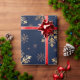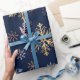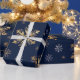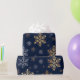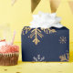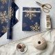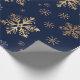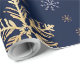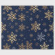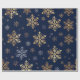 This image features a roll of elegant gift wrapping paper decorated with large, artistic gold-coloured snowflake designs set against a deep navy blue background. The pattern includes various intricate snowflake shapes, some highlighted with a gold metallic effect and others in subtle contrasting tones. This luxurious and festive wrapping paper is perfect for holiday gifts, especially during winter or Christmas celebrations, adding a sophisticated and sparkling touch to any present.