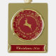 This pretty holiday ornament features a gold faux glitter snowflake border. The matching dark red centre has a faux glitter reindeer in the centre of curved text that says Merry Christmas and Happy New Year. The bottom has your custom text in light gold on a matching red background. Elegant! *Please note - the image is printed and contains no actual glitter.*