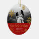 Bright Christmas holiday photo ornament with gold snowflakes and bright red background for engaged couple. Personalise it by adding your names. It's a good gift for newly weds or for a fiance/fiiancee.