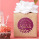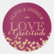 Elegant gold and wine berry sparkle light wedding sticker with golden text. "With love and gratitude", thank you wedding favour sticker.
