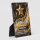Beautiful image of gold and black art design, custom personalised with your award title and recipient. This beautiful, unique and artistic gold star award plaque is easily customised online and features a black background with an image of a gold star and wave shape. Great for businesses, conferences, corporations, employee of the month award or any desired purpose. Custom generative AI design. Stylish, handsome and classy.
