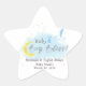 Each sticker features a soft sky blue background, reminiscent of a starry night sky, sprinkled with shimmering gold stars. At the centre, a graceful stork is depicted soaring through the sky, delivering a precious baby boy. The gold accents, including a glowing crescent moon, add a luxurious and sophisticated touch, making these stickers not just a decorative element but a beautiful keepsake for your guests.
