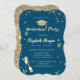 Gold glitter graduation cap, champagne glass, and stars on blue background.