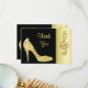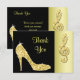 Women's personalised, elegant custom Thank You cards for birthday parties with glitz and glamour. Woman's beautiful gold and black thank you card with a stunning glamourous printed image rhinestones, glitter, sequins, diamonds bling jewels sparkle high heels stilettos fashion shoe, and glittery gold treble cleft on a black and gold background. Chic, classy, cute, girly, modern thank you cards for birthday's or any other event in trendy, fashionable colours / colours. These groovy, fancy, stylish, sophisticated, pretty, girlie cards are decorated / printed on both sides. The back of this thank you card has a space for you to write your own personal thank you message. PLEASE NOTE: All products on Zazzle have flat printed images.