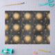 This celestial design showcases golden suns and sceptres on a black background. Perfect for decoupage artwork, paper crafts, or gift wrapping.