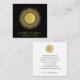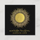 A chic handrafted jewellery designer business card featuring a modern gold sun mandala with sun rays, and phases of the moon, with a pretty, modern script signature type.