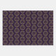 Celestial themed wrapping paper features gold illustration of combined sun and moon faces on eggplant purple, wine red and black backgrounds
