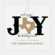 Wishing friends and family Texas-sized joy this holiday season is easy with this design. The "O" in joy is replaced by the shape of Texas with a heart cut out of the centre. Western-style lettering paired with handwritten text. Personalise the front with your family names and the back with your favourite photo. Design allows for you to choose your own colours. Comes in red, green, blue, lavender, aqua, maroon, burnt orange, gold and silver. Matching products available.