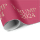 This Donald Trump 2024 presidential campaign gift wrapping paper features a red background. TRUMP is printed in the centre in a gold foil pattern, with the election year 2024 printed below it. Proudly display your support for our president with every gift.