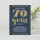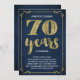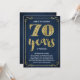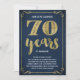 This swanky, stylish 70th wedding anniversary party invitation features vintage typography, elegant flourishes, brush script calligraphy, faux gold foil, and a chic navy blue background.