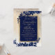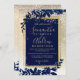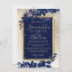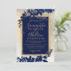 A modern, chic and elegant gold typography Floral navy blue watercolor Christmas winter wedding party invitation with hand painted blue watercolor leaf foliage on a chic yellow gold gradient with white snow and snowflakes..