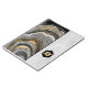 Vibrant gold veins create a dramatic contrast to the rich black and grey tones of the agate pattern which sits beside a beautifully textured silver background. A black and gold geometric frame set on the silver side of the modern-looking notebook draws your eye to the monogram initial, which you can quickly change on the Personalise template.