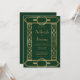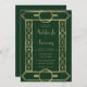 This elegant vintage-inspired wedding invitation features gold-coloured text on a dark emerald green background, framed by a stylish vintage geometric art deco border in faux gold foil. The reverse side is solid emerald green.
