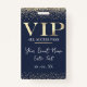 This glamourous VIP all access pass badge features a sophisticated design on a navy blue background. The VIP title is printed in a gold foil style font, followed by the event title. A band of gold glitter diamonds accents the top and bottom portions. The party or event location and time are printed on the back. It's perfect for a birthday party, sweet 16, bridal shower, or other elegant celebration.